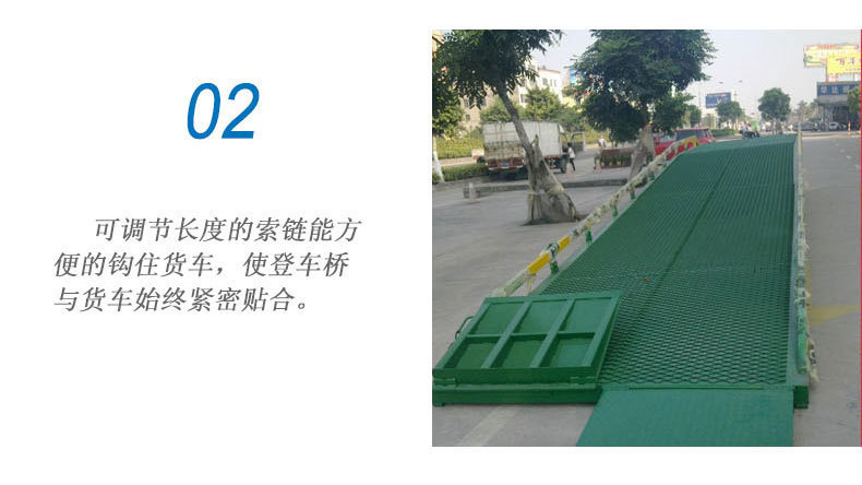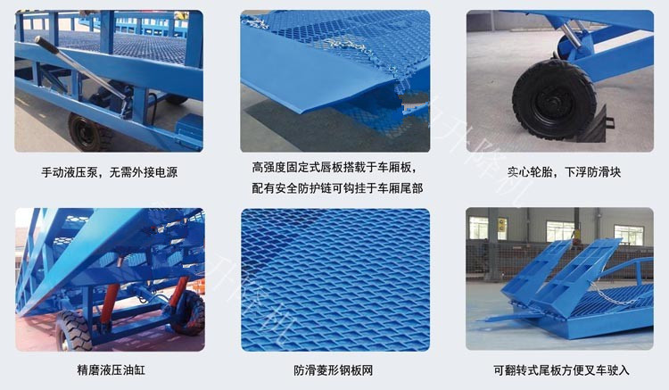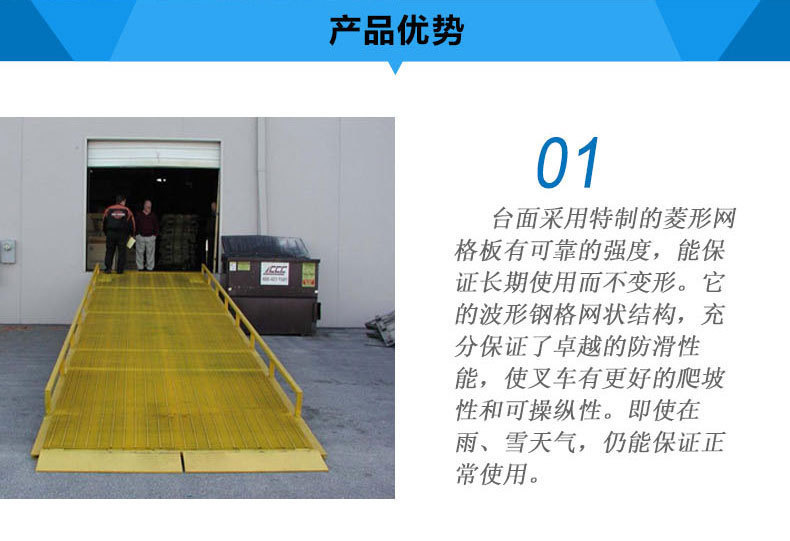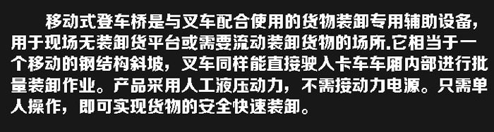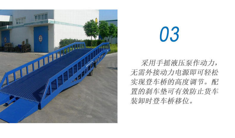 移動(dòng)式登車橋是與叉車配合使用的貨物裝卸專用輔助設(shè)備,用于現(xiàn)場(chǎng)無裝卸貨平臺(tái)或需要流動(dòng)裝卸貨物的場(chǎng)所。它相當(dāng)于一個(gè)移動(dòng)的鋼結(jié)構(gòu)斜坡,叉車同樣能直接駛?cè)肟ㄜ囓噹麅?nèi)部進(jìn)行批量裝卸作業(yè)。產(chǎn)品采用人工液壓動(dòng)力,不需接動(dòng)力電源。只需單人操作,即可實(shí)現(xiàn)貨物的安全快速裝卸。它可使企業(yè)減少大量勞動(dòng)力,成倍提高裝卸作業(yè)效率,加快貨物流通速度,獲取更大的經(jīng)濟(jì)效益。