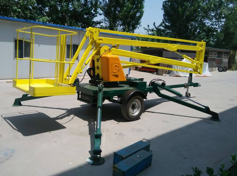 拖車折臂式升降機:可以掛在汽車上,與汽車同步,適合野外高空作業(yè)。